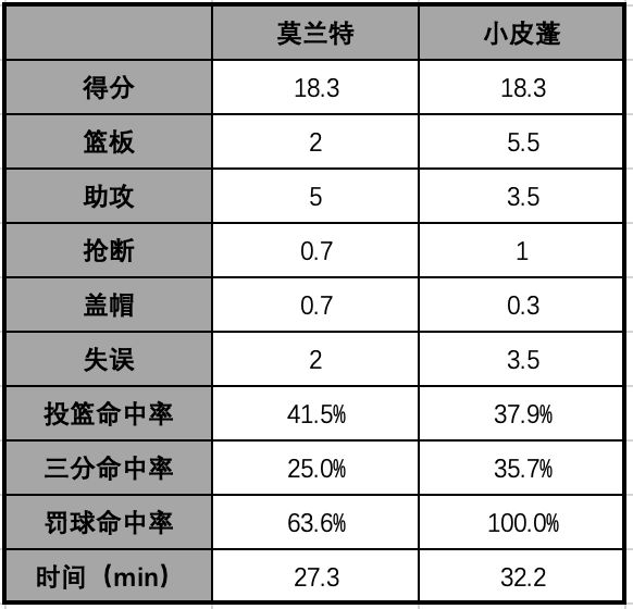 4场系列赛,小皮蓬场均得分18.3分,和莫兰特并列全队第一。两个人的场均数据相比较,小皮蓬的工作完成得已经足够好了吧!
