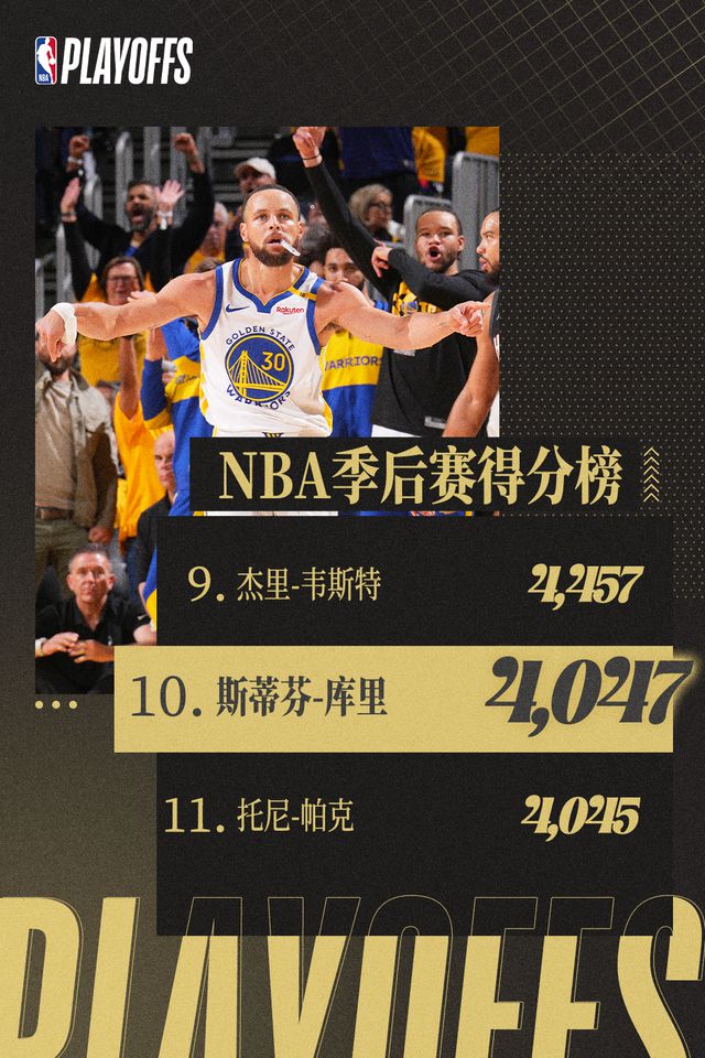 库里的季后赛总得分超越托尼-帕克,升至历史第10位。排在第9的杰里-韦斯特,是排在库里前面仅存的控卫了。